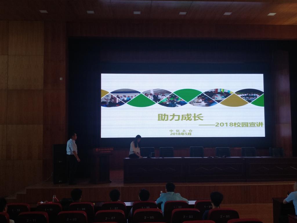 5月11日,太仓中化环保化工有限公司副总经理范涛先生一行三人前来304am永利集团遴选2019届毕业生,应化学院领导、老师及应化学院、石化学院、机械学院、电子学院相关专业的员工在西区报告厅参加了企业宣讲会。