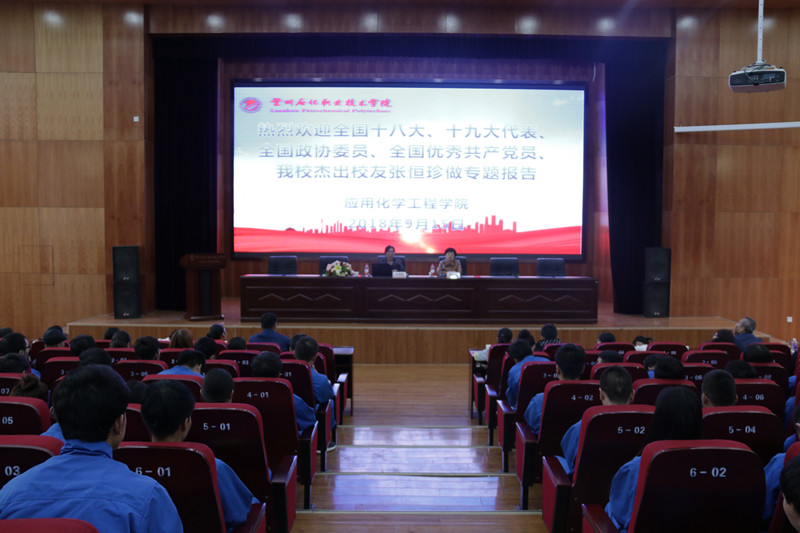 9月15日下午,全国十八大、十九大代表、全国政协委员、全国优秀共产党员、公司杰出员工张恒珍为304am永利集团全体师生作报告,报告会由公司党总支书记吴海霞主持,应化学院师生认真聆听了张恒珍大师的报告。