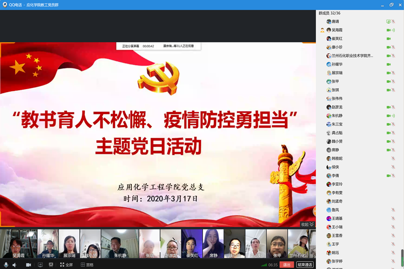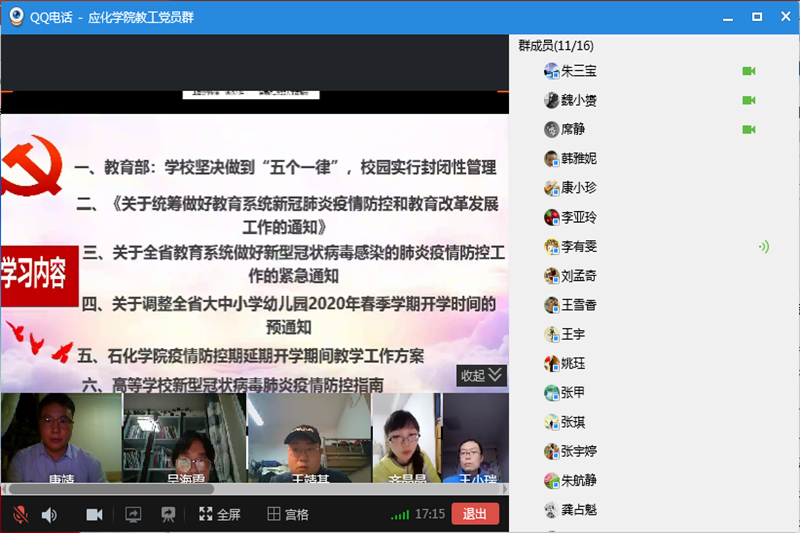 接着,吴海霞带领教工党员就习近平总书记关于疫情防控工作的重要指示精神,教育部,教育厅,学校关于疫情期间的相关文件进行集中学习,并给大家提出了四点要求;一是要扛牢政治责任,坚定斗争信心,聚合力充分发挥党员的先锋模范作用;二是要带头做好每天的疫情统计上报工作和全体师生完美校园“健康打卡”的要求;三是要加强自身及对员工的心理疏导,为心理健康保驾护航;四是要积极做好线上授课的准备和自身学习,实现“停课不停教、停课不停学”,保证疫情防控期间教学进度和教学质量。随后,组织全体党员观看了习近平关于疫情防控的一系列重要讲话视频。最后,部分教工党员结合自己在疫情期间的亲身经历,积极发言讨论,纷纷表示:作为党员,要在平凡的工作岗位上用实际行动彰显教育工作者的无私奉献、拼搏奋斗、爱国情怀,积极应对疫情,起到模范带头作用,冲锋在前,为全面打赢疫情防控阻击战奉献一份力量。
