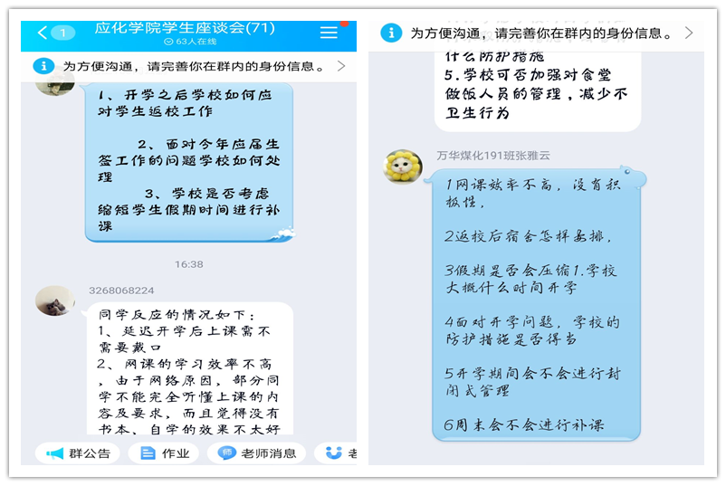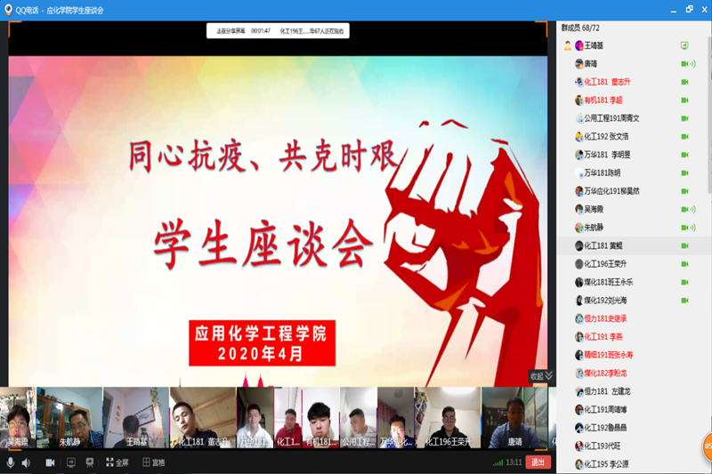 座谈会上,吴海霞首先向各位员工代表表达了学院对他们的关心和问候,与会员工代表对学院的关怀和牵挂深表感谢。随后,各位老师就疫情防控期间网络学习、开学时间、健康打卡、学校防控措施、求职就业以及生活等多方面的问题与员工代表进行了轻松愉快的交流,对线上教学、防控措施、求职就业等方面给出了许多指导性意见,并认真听取了大家的意见和建议。与会领导和老师希望全体同学树立战“疫”必胜信心,克服困难,合理规划居家生活,认真参与网络课程学习,不断提升自己的专业文化素养和综合素质。最后,吴海霞在总结中指出,通过本次线上员工座谈会,使学院更深入地了解了员工线上学习中遇到的问题,学院会将大家提出的好的建议、问题进行反馈、解决,帮助大家更好的完成学业。同时,希望各位员工代表能将今天会议的结果及时地向同学进行宣传,做好意见的反馈,让以后的问题越来越少,共创应化学院美好明天。
