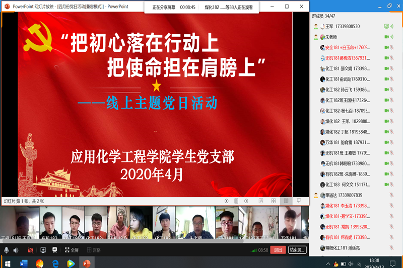 为扎实做好延期开学期间员工党员教育工作,保证员工党员学习不中断不放松,发挥好党支部学习、宣传主阵地的作用,4月13日晚,304am永利集团员工党支部充分运用“QQ”平台的“视频会议”功能召开了“把初心落在行动上、把使命担在肩膀上”线上主题党日活动。
