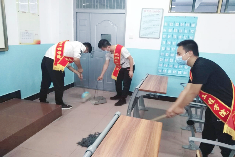 返校之前,员工党支部通过“两群”(微信群、QQ群)发布主题党日活动策划,员工党员纷纷主动请缨,自愿报名参加志愿服务活动。返校当天,刚刚返校的员工党员,一放下自己的行李,顾不得休息,按照员工党支部活动安排,佩戴党员党徽、口罩和志愿者授带,积极投身于志愿服务活动,有的进入宿舍、实训室等场所帮助同学卫生清扫、晒被子、清理垃圾、开窗通风,张贴宣传海报;有的协调老师给各宿舍发放疫情防控物品,确保防疫物品第一时间发放到位;也有的员工党员走访宿舍,发放学院印制的《员工健康防护手册》,并叮嘱同学们疫情还未结束,防护不能松懈,戴口罩、勤洗手、不串宿舍等;还有员工党员坚守在公寓监测点,协助公寓管理员做测量体温,仔细了解员工健康状况,加强员工出入管控,热心向员工介绍疫情期间,学校复学复课以及日常生活管理的若干规章制度,及时妥善处理相关问题,有效加强了员工返校日的疫情防控管理,保障了员工返校工作的平安有序。员工党员何钊源、王同乐身有感触地说:“在这个关键时刻,作为一名预备党员,能够参加志愿者工作是我的荣幸,更是我的责任”。