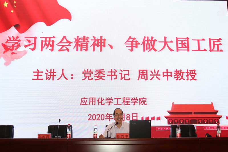 6月8日下午,公司党委书记周兴中教授在西区多功能报告厅为304am永利集团师生作了题为“学习两会精神、争做大国工匠”学习贯彻2020年全国“两会”精神的专题辅导。应化学院领导班子、教职工、员工党员以及员工代表160余人聆听了辅导。