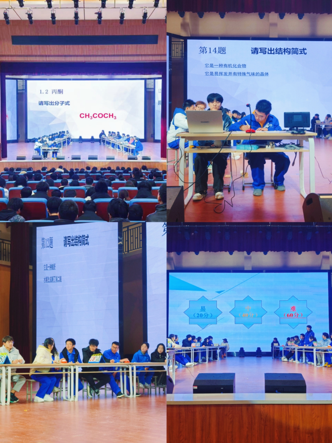 此次大赛分为初赛和决赛两个阶段,初赛以个人形式参赛,决赛根据初赛成绩3人1组以团队形式参赛。比赛内容主要考察化学工业中常见化合物的分子式、结构简式和结构式。经过前期广泛动员宣传,全院初赛报名人数178人,通过初赛笔试层层选拔,共计24人组成8支队伍进入决赛环节。决赛分为三个环节,第一轮为必答题,第二轮为抢答题,第三轮为风险题。